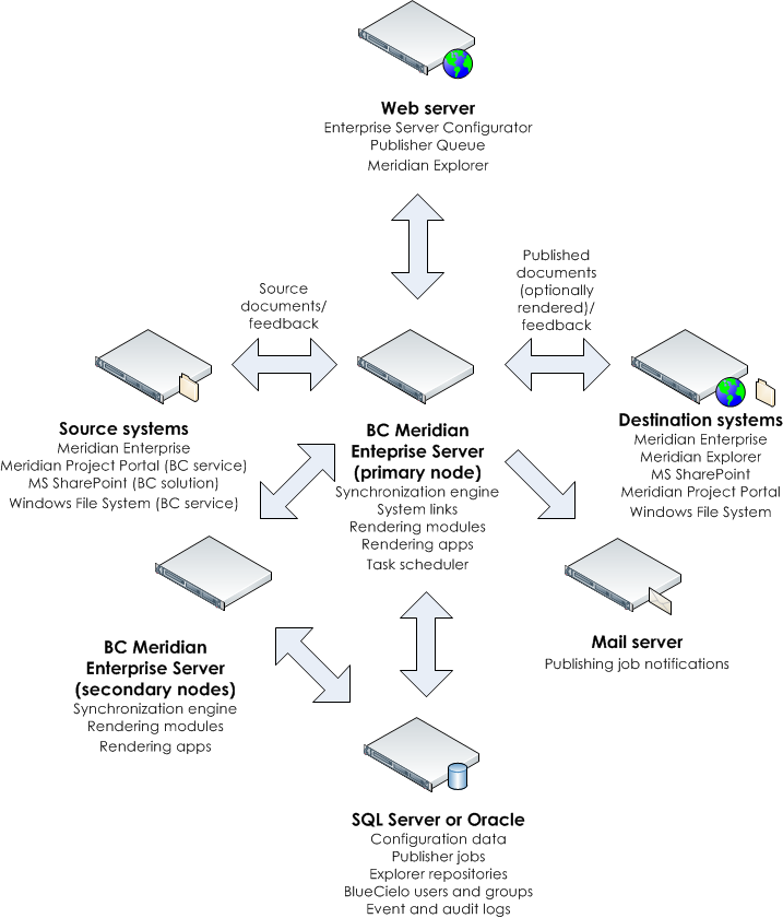 Meridian Enterprise Server can be configured through a web application that runs on the web server. The Meridian Enterprise Server server and the web server can be the same computer in small to medium size environments. Meridian Enterprise Server stores all of its configuration and publishing job data on the database server along with user and group definitions and Meridian Explorer repository data. The Meridian Explorer repository can be viewed with a web application running on the web server.