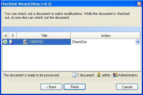 1. Confirm the information shown is correct and click Finish. The document is checked out.